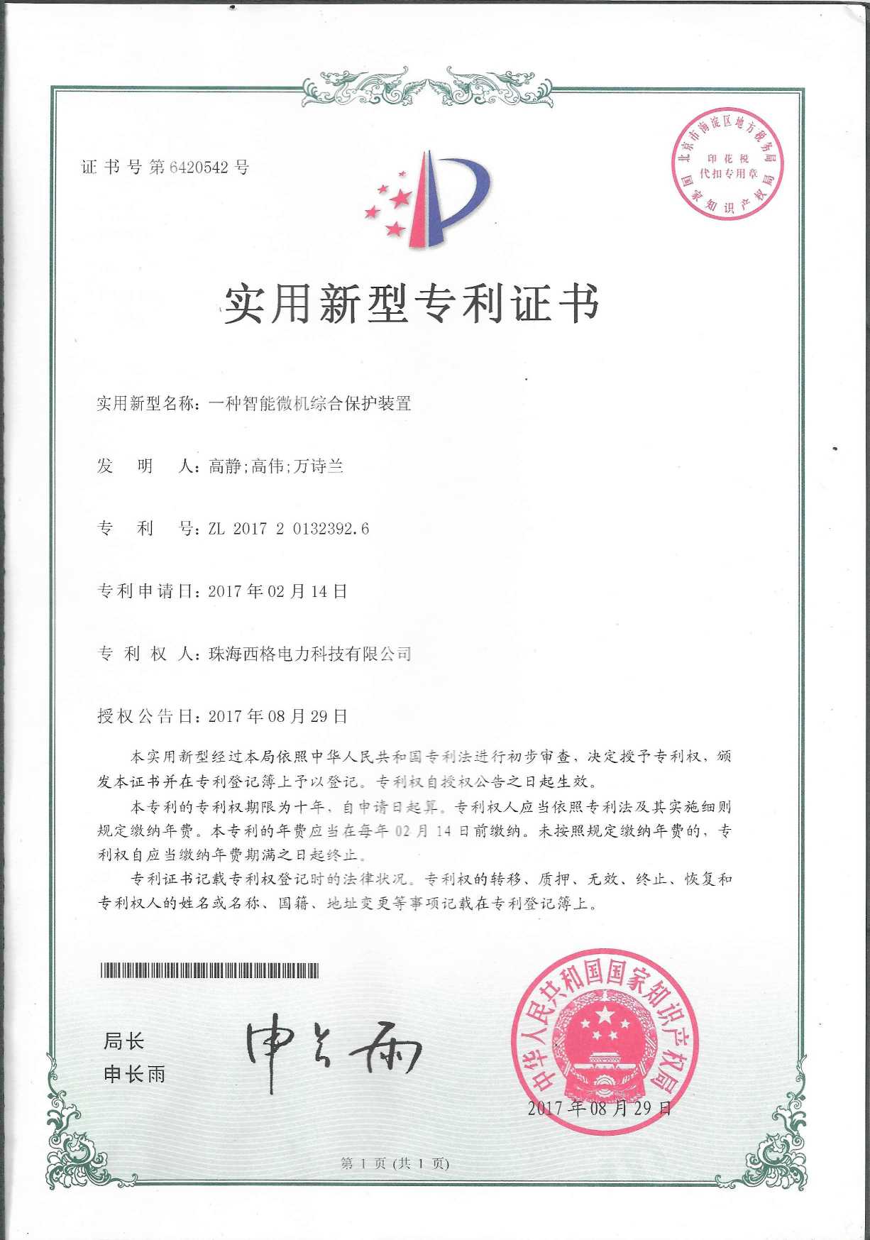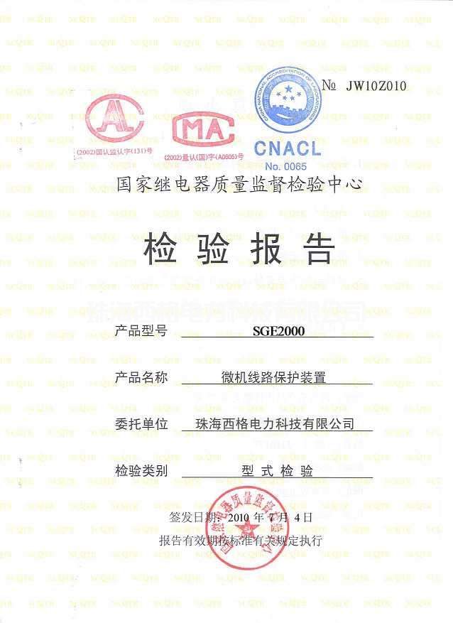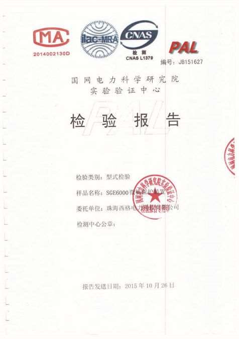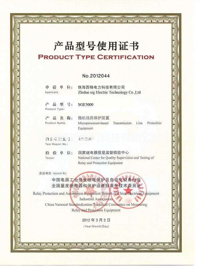 微机线路保护装置产品使用证书