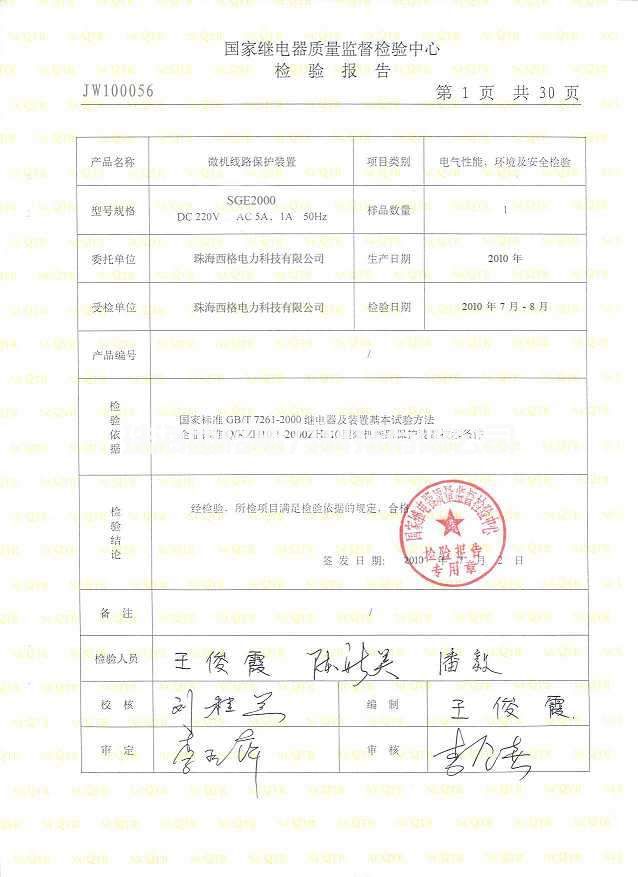 微机线路保护装置检验报告