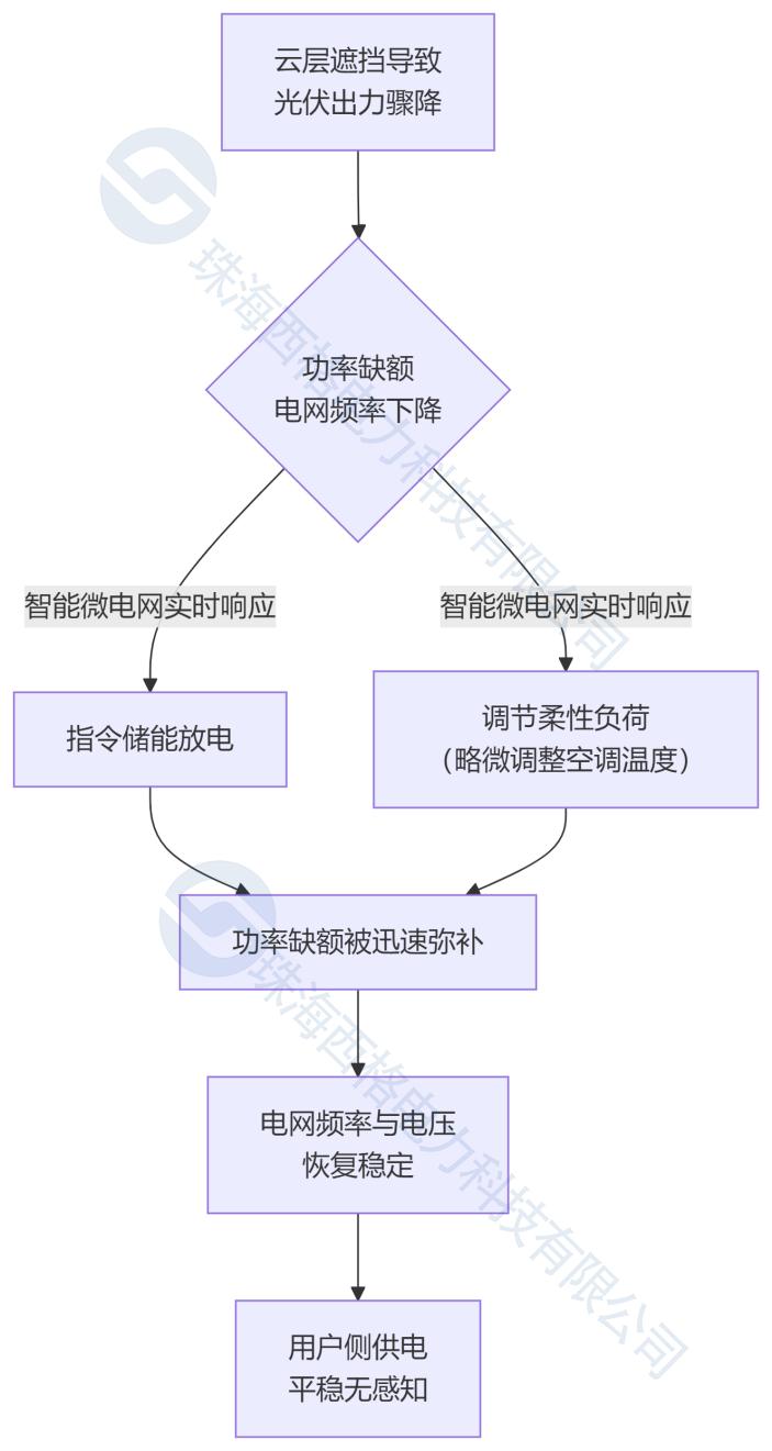 当绿电出力出现突发波动时,智能微电网通过 “多资源协同调控”,实时平衡供需 —— 核心是 “源随荷动” 与 “荷随源动” 相结合,即通过调整绿电出力、启动储能、优化负荷,快速填补供需缺口。